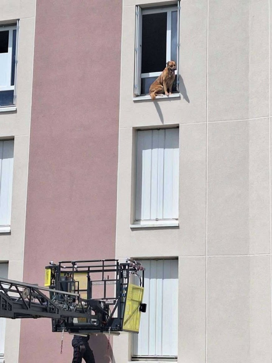 La jeune chienne, laissée seule quelques instants, aurait confondu le rebord de la fenêtre avec un balcon et s’est retrouvée piégée au-dessus du vide, incapable de revenir à l’intérieur. Les pompiers sont rapidement intervenus avec la grande échelle pour la secourir.